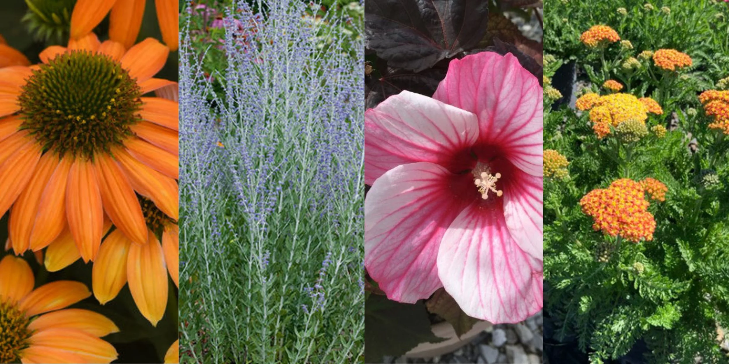 (From left to right: Artisan Soft Orange Conflower; Little Spire Russian Sage; Moonshadow Rosita Hibiscus; Skysail Fire Yarrow)