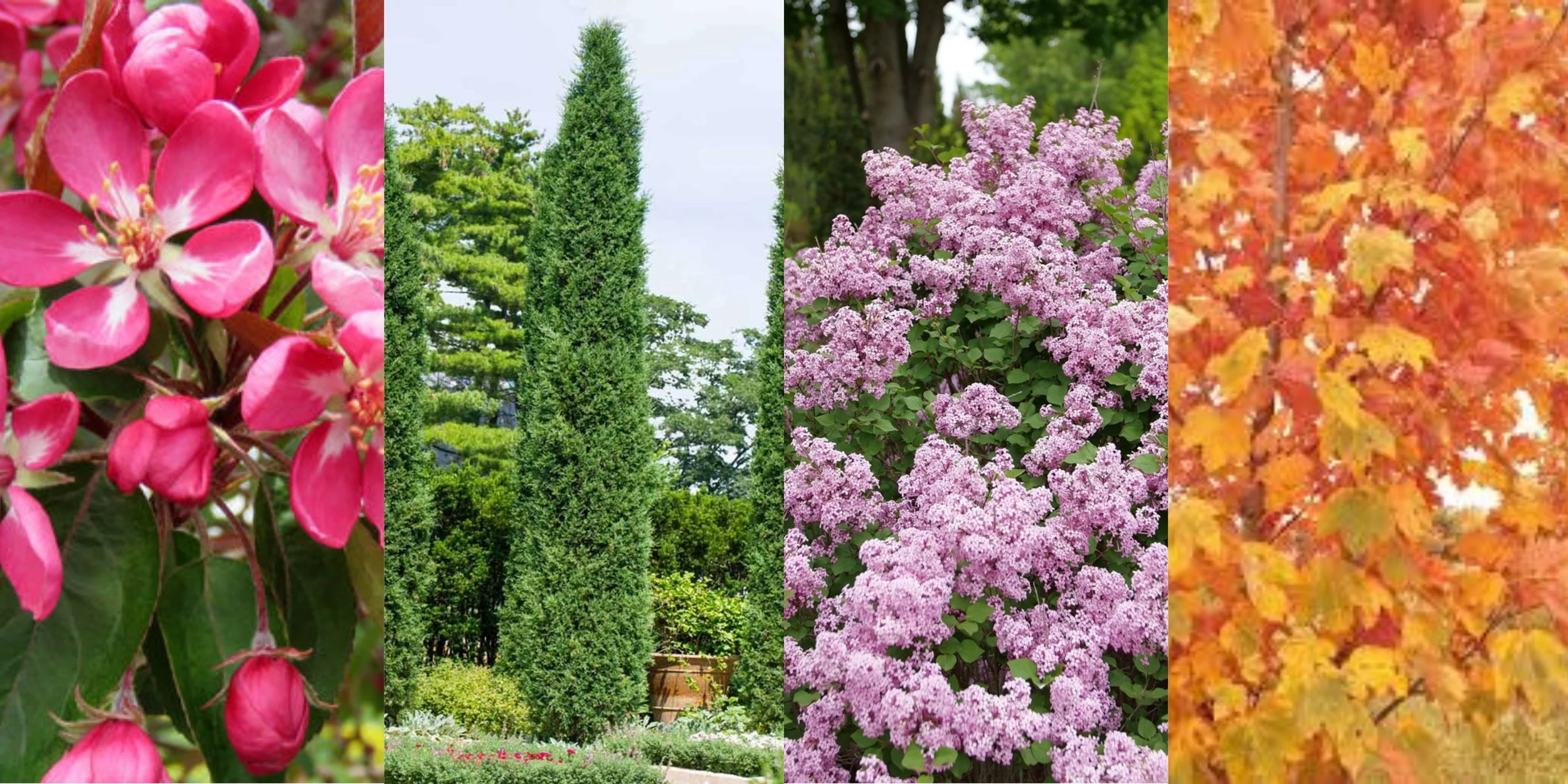 (From left to right: Courageous Crabapple, Taylor Juniper, Bloomerang Purpink Lilac, Regal Petticoat Maple)